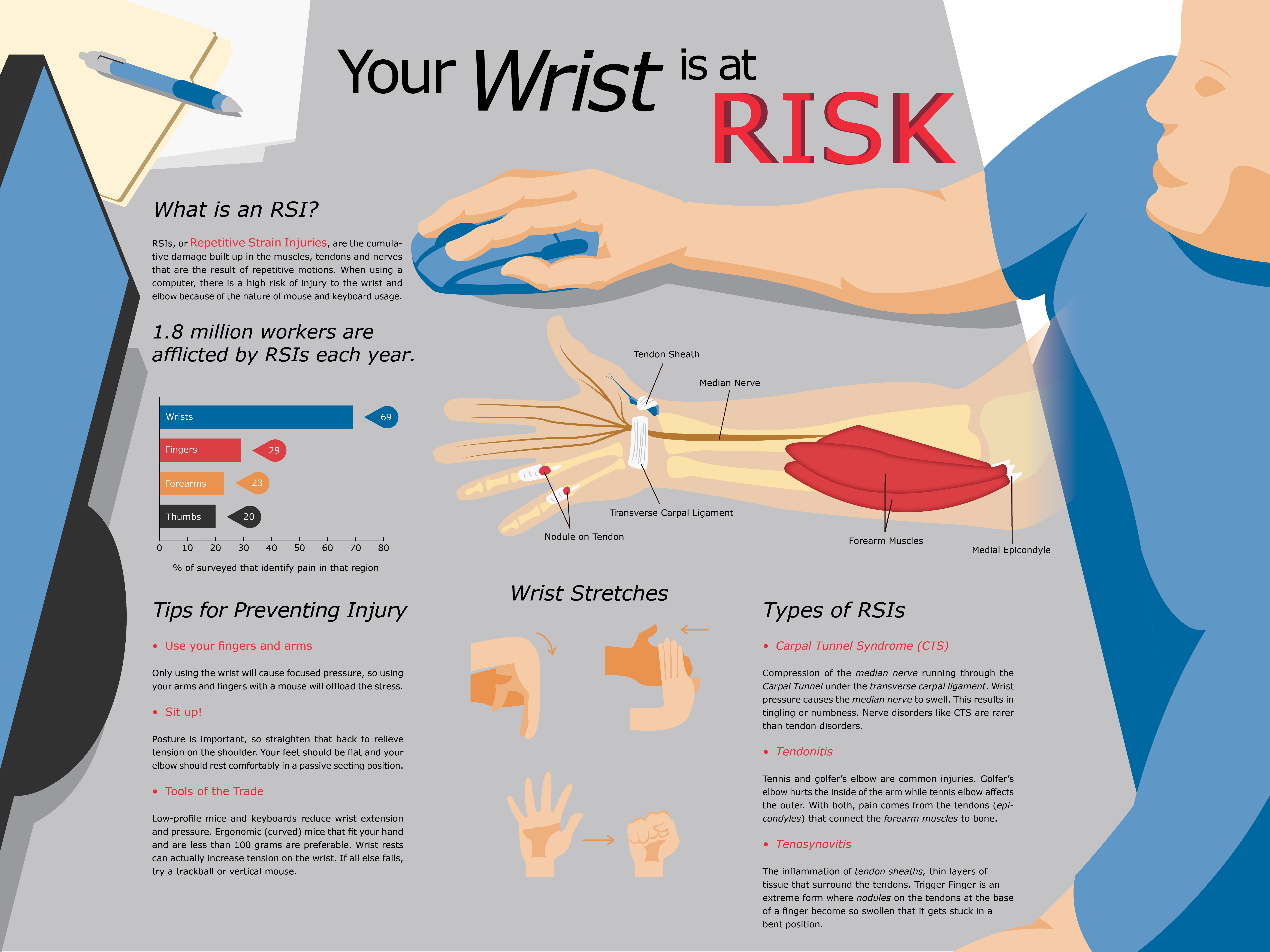 Infographic focusing on the dangers of repetitive stress injuries from computer work and the best practices for preventing them.