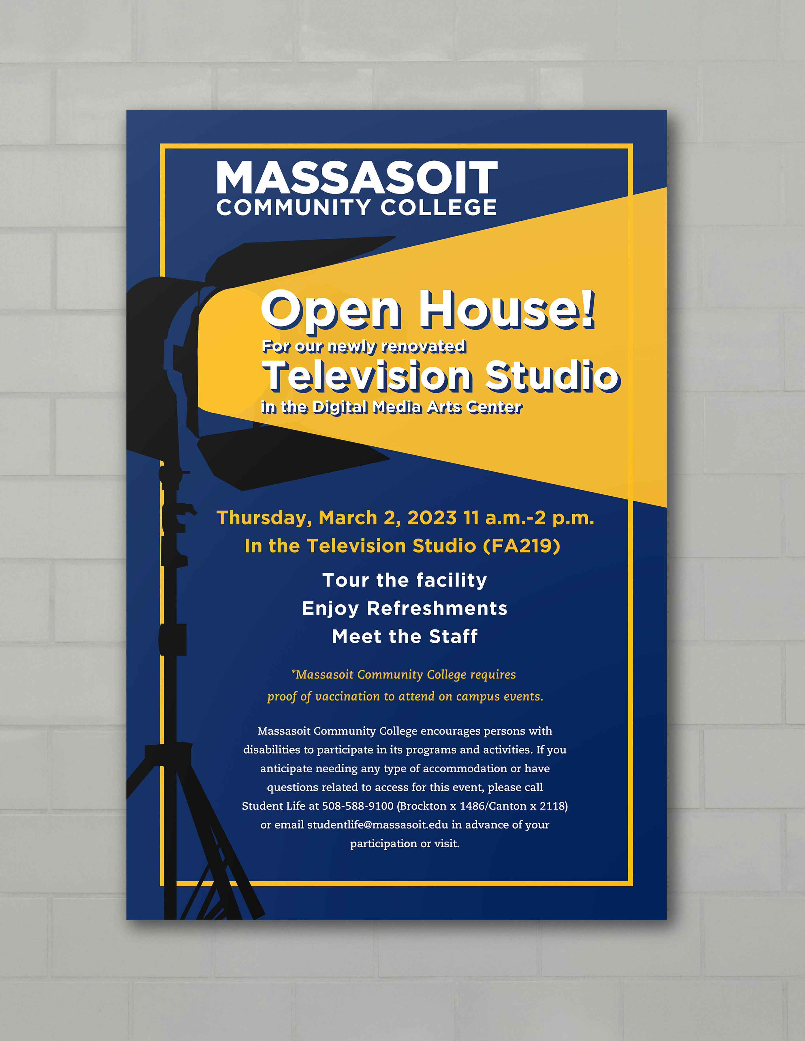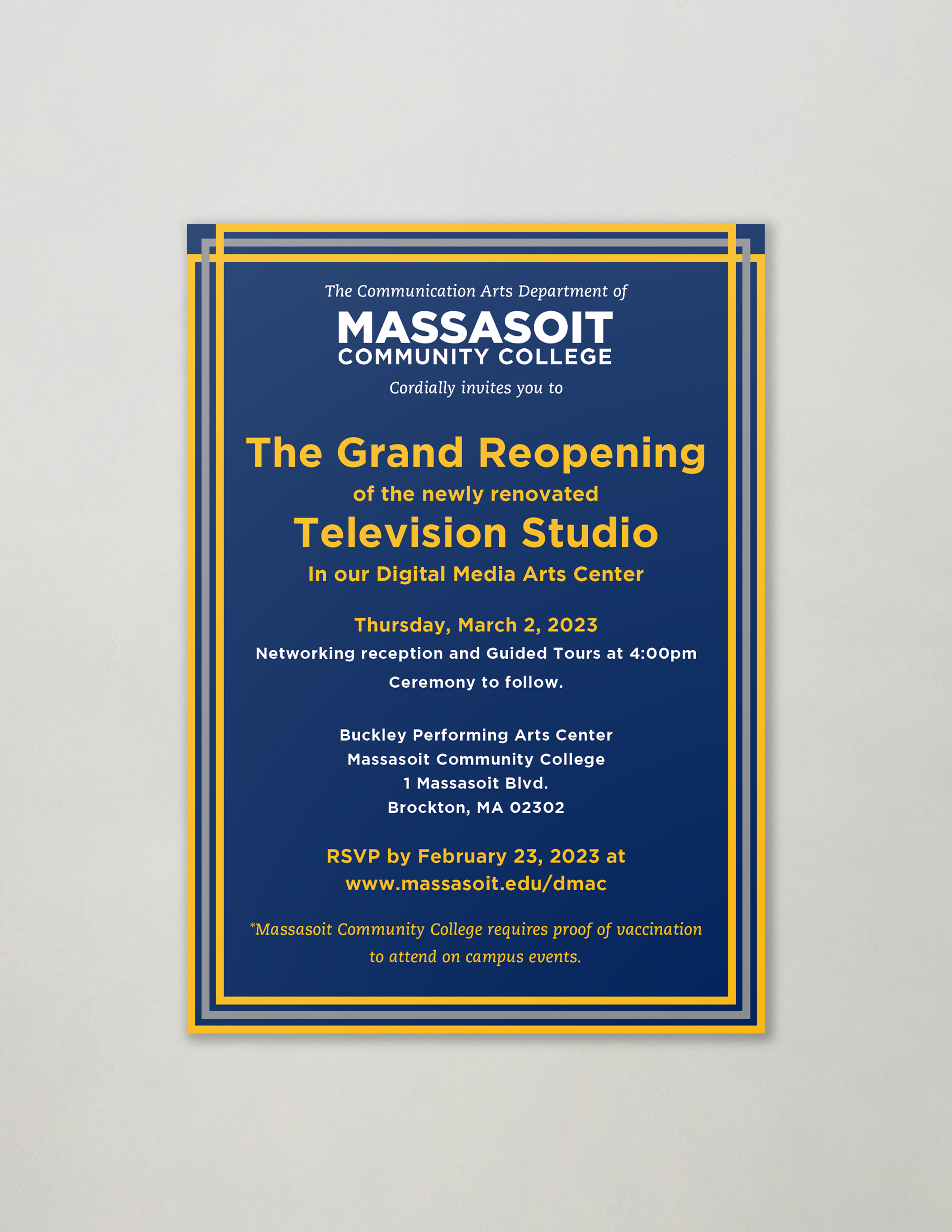 A set of promotional materials for Massasoit Community College's Television Studio reopening.